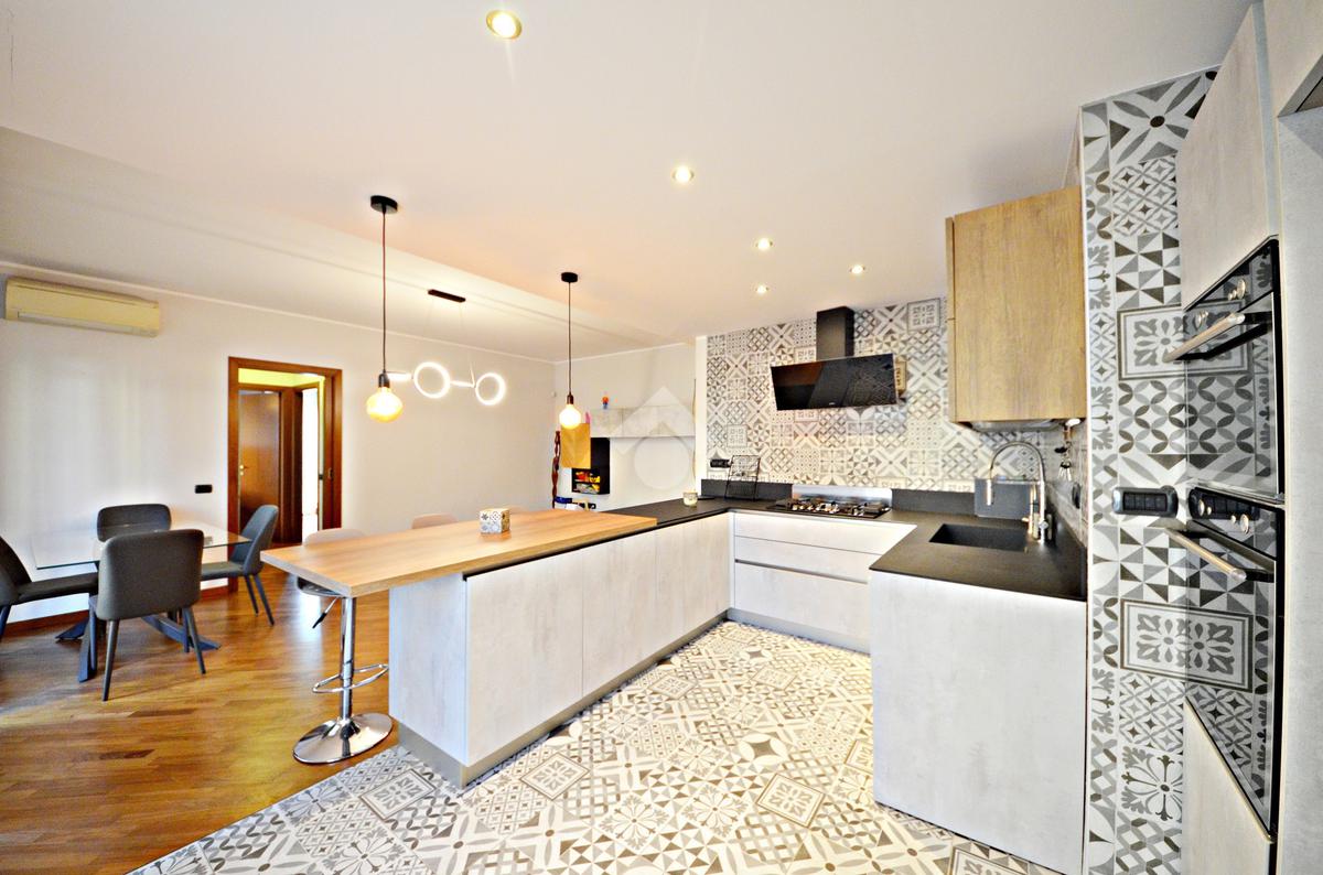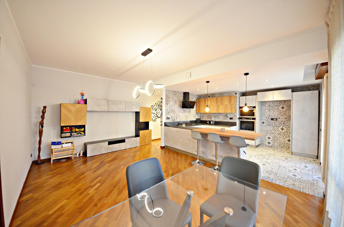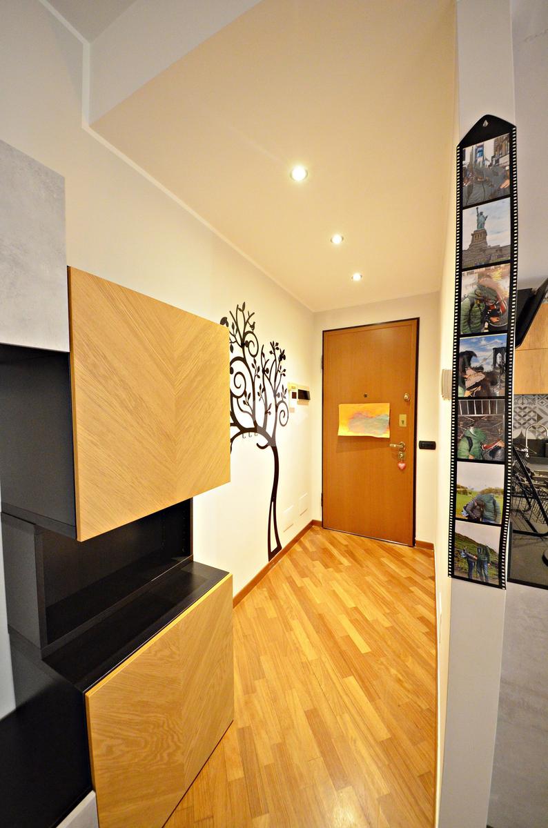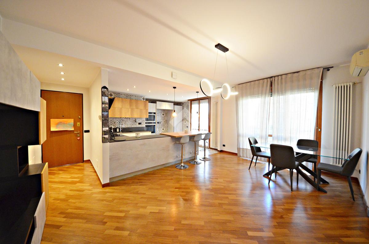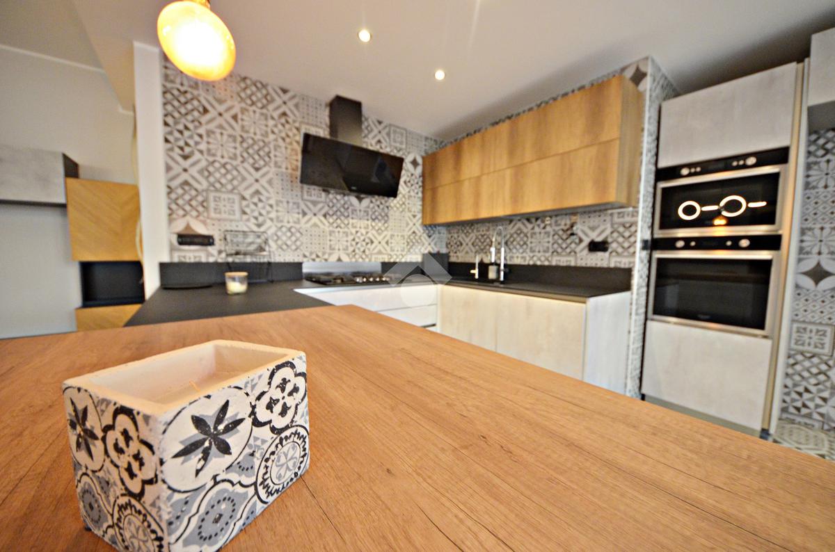 L'ingresso ci introduce direttamente nel soggiorno e, separata con una penisola, nella comoda cucina a vista - entrambi con affaccio sul terrazzino.