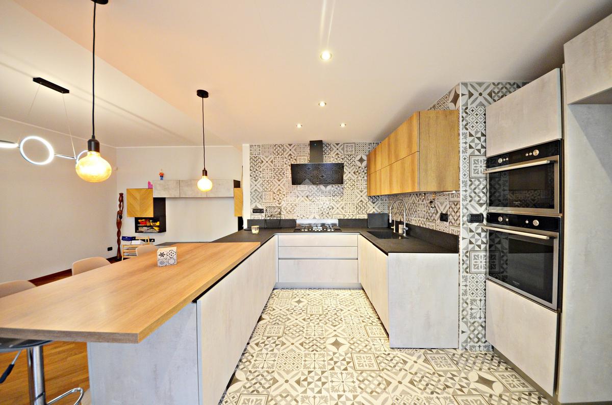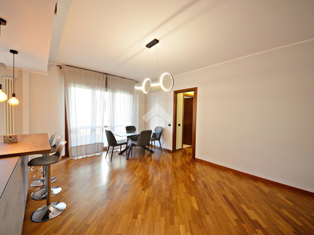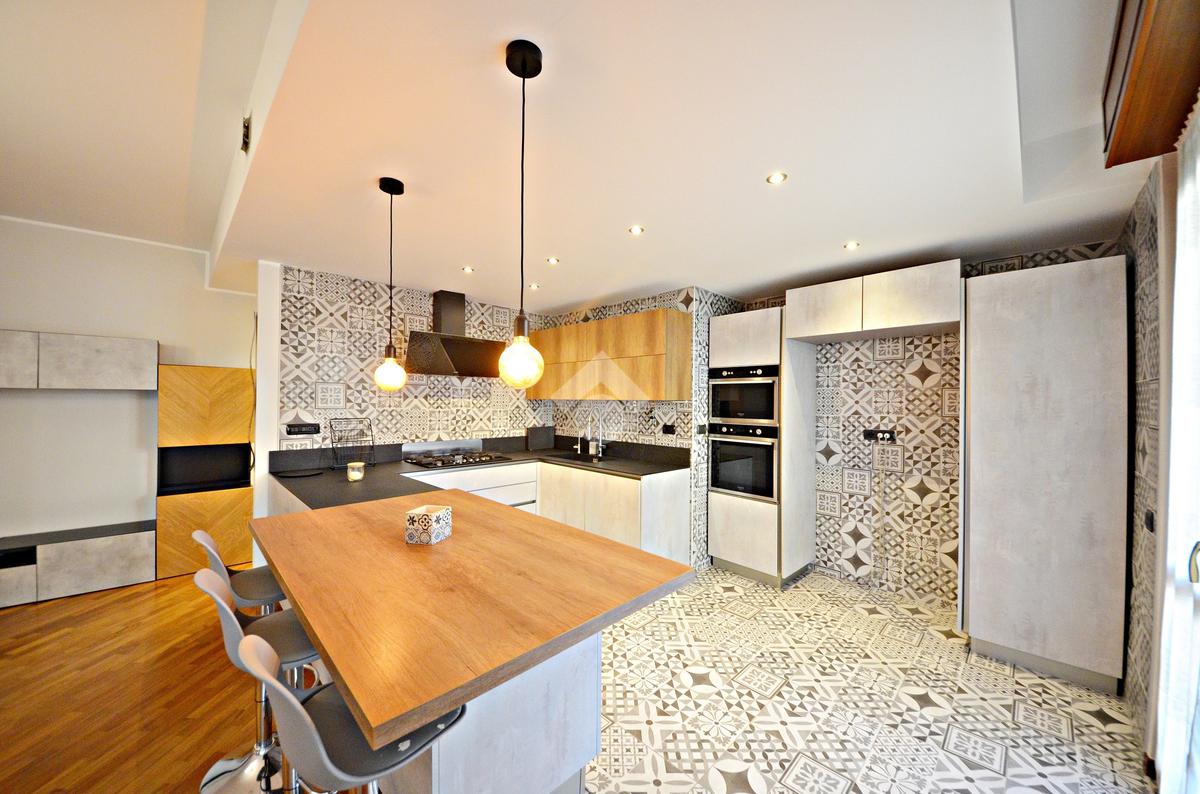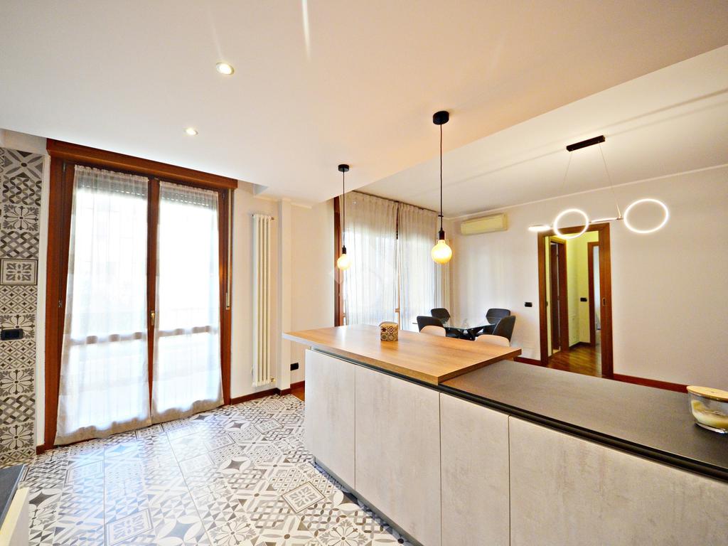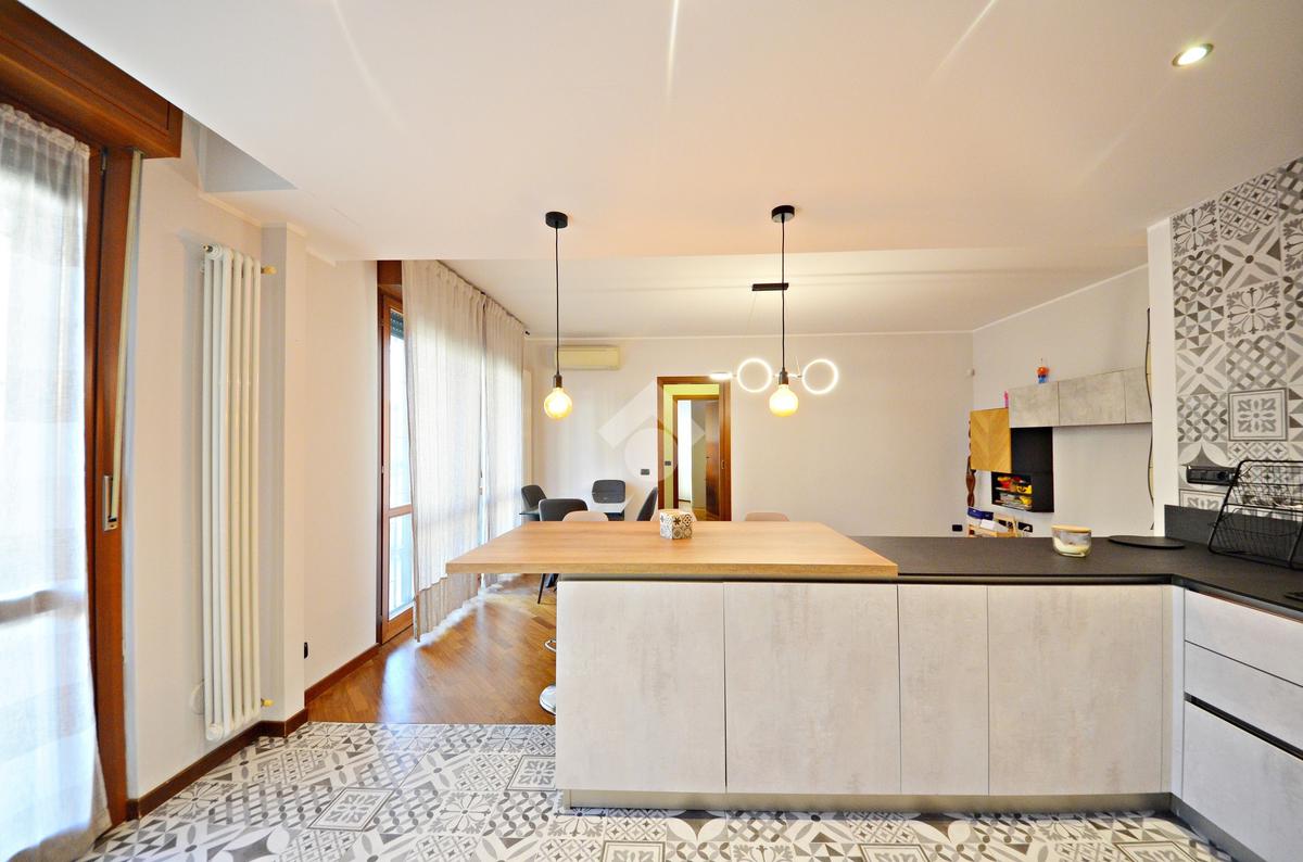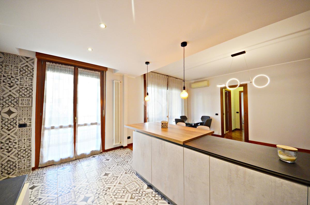 L'ingresso ci introduce direttamente nel soggiorno e, separata con una penisola, nella comoda cucina a vista - entrambi con affaccio sul terrazzino.